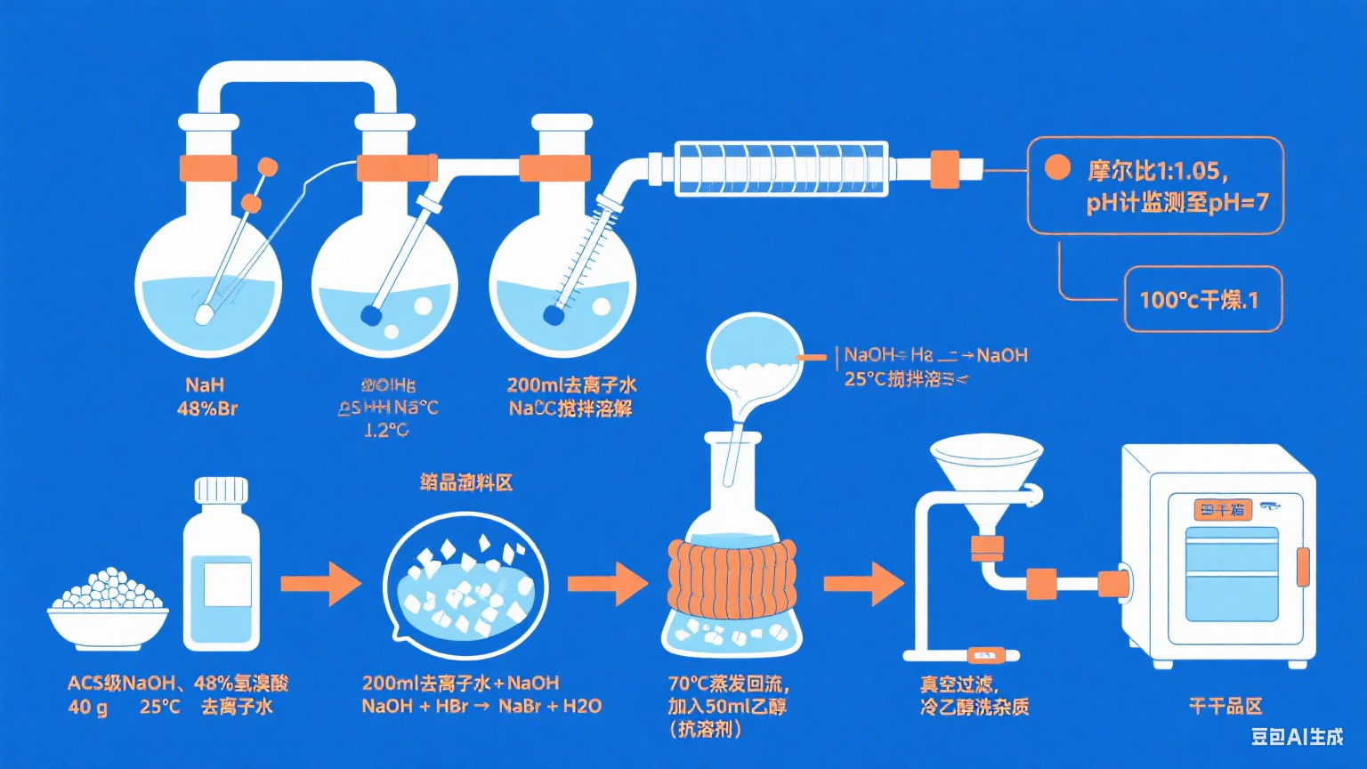 然后,將過濾后的溴化鈉晶體在100°C的干燥箱中干燥12小時。此步驟確保去除任何吸附的水分,得到無水產品。